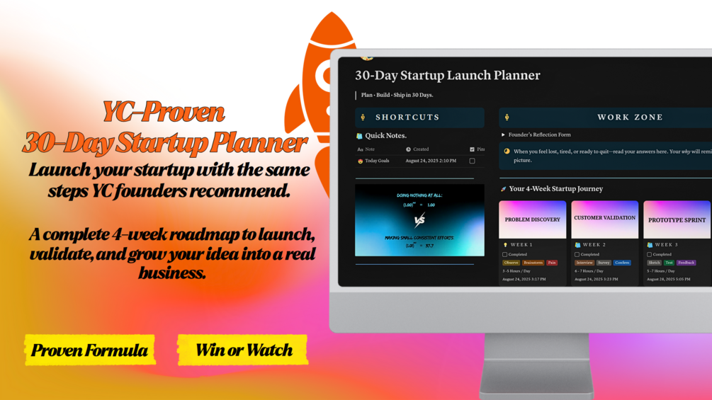 YC (Y Combinator) founders — the minds behind billion-dollar companies like Airbnb, Dropbox, and Stripe — recommend a faster, smarter, proven approach. Now, you can follow the exact method top founders use with this 30-Day Startup Launch Planner (Notion Template).
